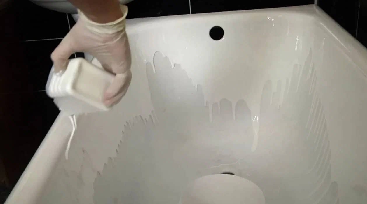 - Далее на поверхность ванны наносится средство с высокой концентрацией щавелевой кислоты. Кислота до конца очищает поры ванны от жира и загрязнений.